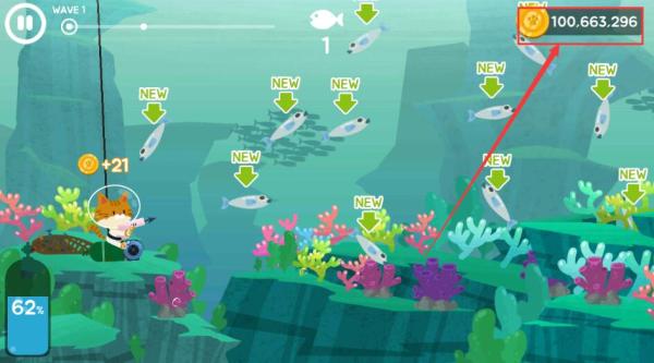 ● 分享一波抓大型鱼攻略,以刷在珊瑚为例,前期,不要乱动,只需要清理一些中型食肉鱼,以免影响收集氧气鱼,然后就可以疯狂收集氧气鱼了,这样会让你在第九波之前氧气还是满满的,ps:大型鱼在第九波之后刷。