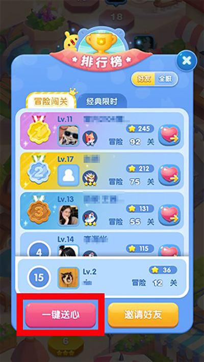 2、在排行榜详细界面可以看到自己的好友,点击一键送心;