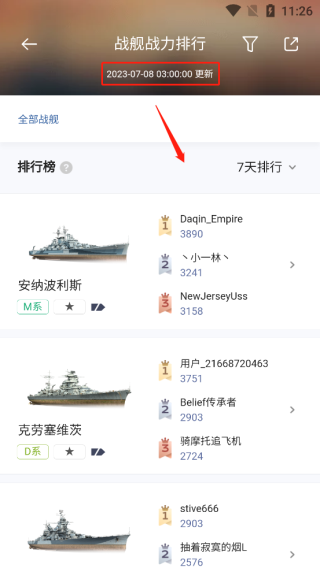 3、以战舰战力排行为例,点击进入,可查看最新排行信息,点击图示“7天排行”