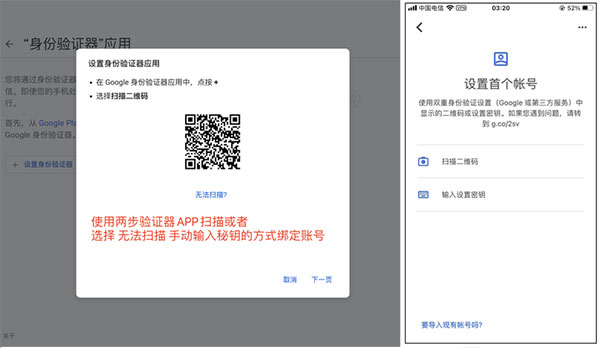 第五步.打开手机安装的Authenticator APP,通过扫码或者选择“无法扫码”手动输入秘钥。