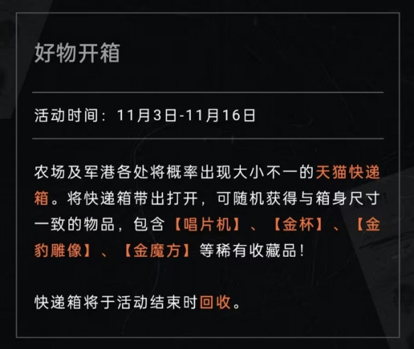 活动开启,带出快递箱有几率获得金色稀有收藏品!暗区显眼包装备再更新,登录即可领取【天猫显眼包】背包!