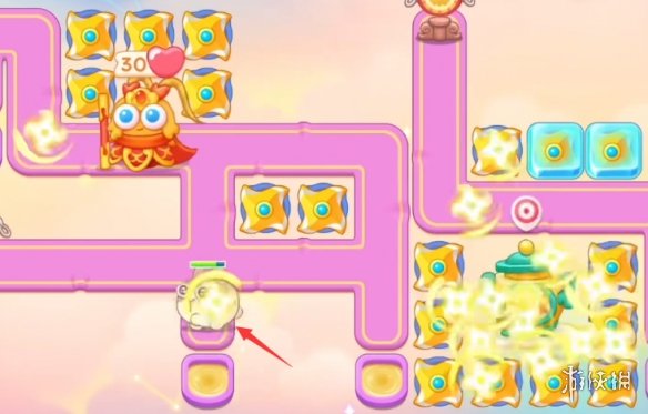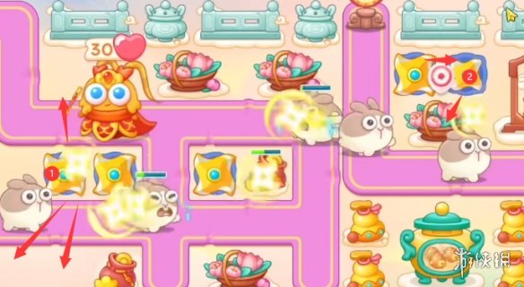 3、第一波最后留一只兔子,右边忍者镖先清小建筑最后清钟,左边最后兔子过来也可以先把顶上的花篮清了再处理这只兔子。