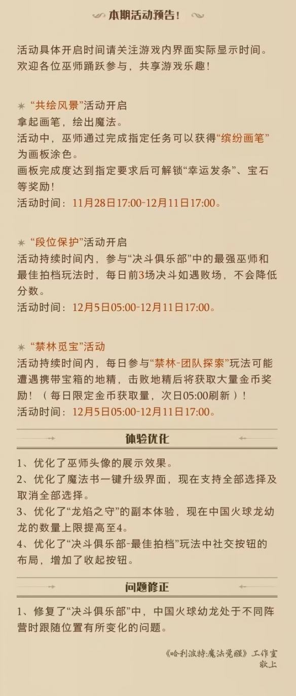 大家期待已久的龙焰噼啪赛季限定卡池即将上线,那么下面就由小编给大家带来哈利波特魔法觉醒11月28日更新公告,希望能给大家带来帮助。