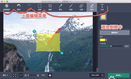 截图后选择编辑符号会直接进入编辑菜单,在编辑界面编辑工具在顶部,分别有添加箭头文字等等操作,例如要添加箭头先点击箭头工具,然后点击右侧的添加,就会在图片中添加,要调整箭头的方位点击箭头上面的点即可。