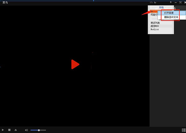 1、点击上面的TV菜单可扩展列表,可以看到本地有TV、可自行添加文件,双击即可进入观看,鼠标右键可以打开目录以及删除选择文件;