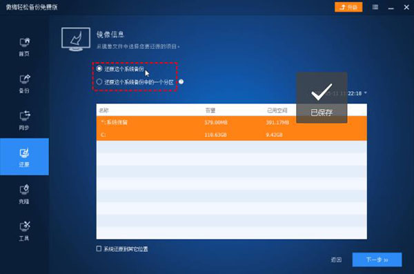 方法二:点击“还原”栏,这时所有的备份任务会呈列出来(如果你的备份任务很多,你可以勾选“系统还原”来筛选),然后选择一个备份任务,点击“下一步”(你也可以浏览路径来选择一个镜像文件,并从该镜像文件中还原数据)。