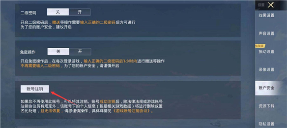 打开设置中的账户安全设置,就颤滚可以看到账户注销选项,点击即可。《和平精英》是由腾讯光子工茄拿余作室群自研打造的反恐军事竞赛体验类型国产手游,虚幻引擎4研发,次世代完美画质,极致视听敏裤感受;超大实景地图,打造指尖战场,全方面自由施展战术;百人同场竞技,每个角色都用自己的特殊技。