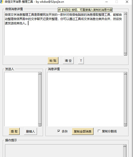 微信文字消息整理工具是一款由网友开发专门针对微信电脑端使用的软件工具,主要的作用就是能够自动提取微信中的文字聊天记录并且进行整理,通过工具自带的功能模块来将文字消息进行分类合并,从而打包发送给其他用户进行使用,整体来说是一款实用性较强的软件工具,能够帮助我们完成很多不同的任务需求。