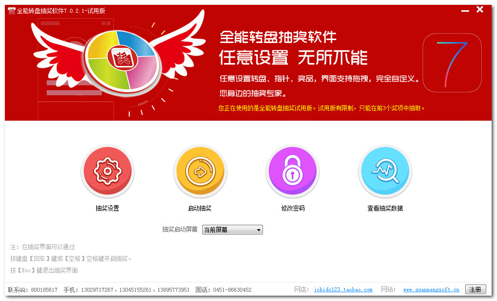 1、支持用户界面完全自定义,任意更改转盘、背景、文字、指针、音乐; 支持语音报奖,可任意生成语音报奖内容;