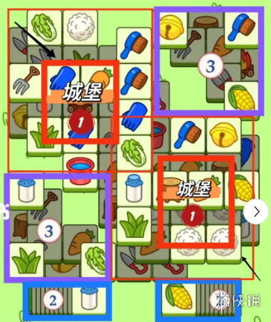 今天的大世界又是两个新城堡,咱也说不上来什么形状,具体形状可以看后面那张图。因为两个城堡都是一样的,可以平消,如果觉得平消很卡或者不习惯平消那就分成左上跟右下两个区域来换着消,不建议一直偏向一边去拿牌。