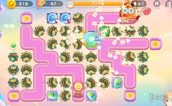 1、开局造两个弓箭升满级,下方打掉道具后加弓箭,也升到满级,解决完第一波全部粉兔后,锁定钱袋。