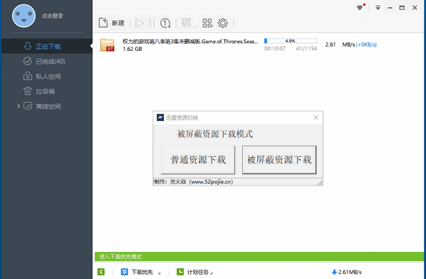 迅雷禁止敏感资本下载的方式应当是将下载信息发送到那三个服务器(另有没有其它服务器不清晰)开启辨别,若是不列为敏感资本或没法链接服务器则直接下载,如许我们只需求直接屏障服务器就行了。为何还需求通俗下载形式,由于像emule、有些bt之类的,用迅雷下载的时候它会帮你提权插队,屏障那些服务器以后就需求本身渐渐列队,有时候乃至一向排不上完全下载不到。所以,不是被屏障的资本,仍是依然用通俗下载形式比力快的。