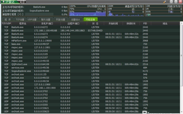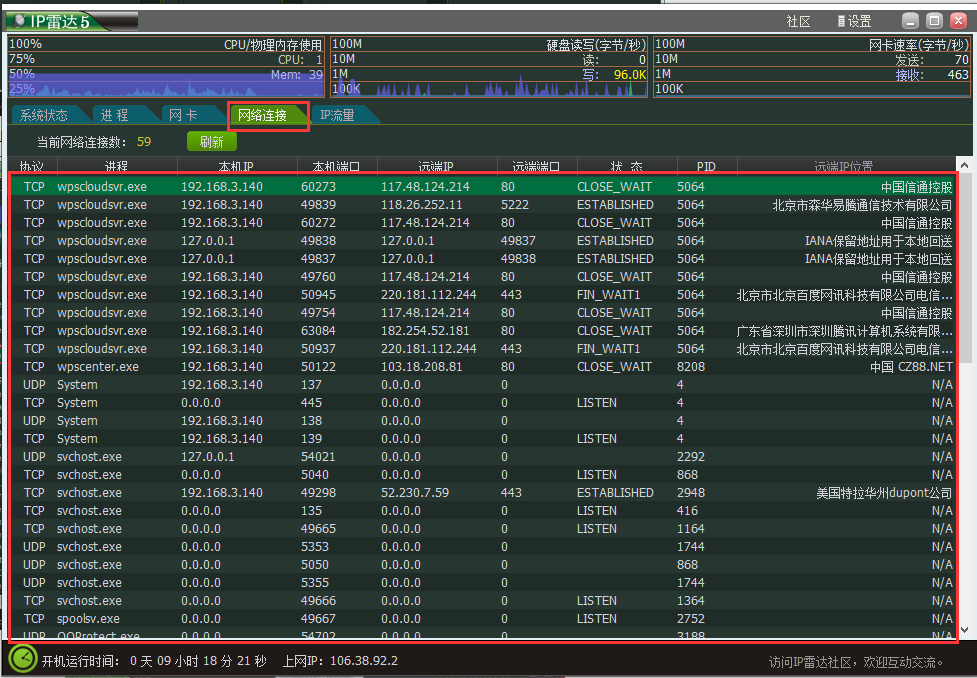 3、IP雷达实时显示每个进程网络流量和硬盘读写。