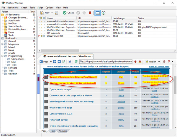 厉害的过滤系统可以让您疏忽不感乐趣的内容。集成的过滤助理让您只需点击几下鼠标便可轻松建立过滤器。WebSite-Watcher 拥有易懂的通配符过滤器和正则表达式。