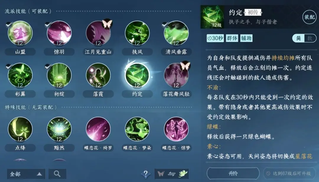 约定:素心姿态专属群体技能,能够为自身和队友提供减伤,并持续均摊所有队员气血。