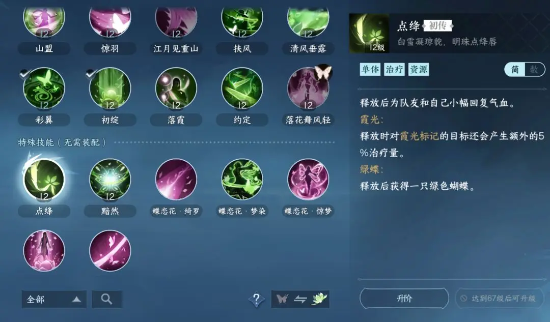 蝶恋花·梦染:集满5个蝴蝶且绿蝶较多的时候,自动释放回复周围友方气血。