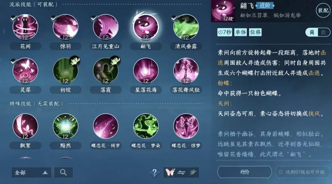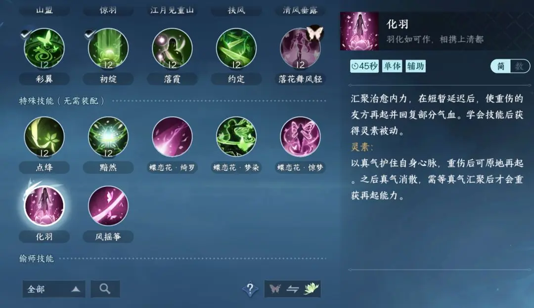 惊羽:单体伤害技能,命中可以获得一只蝴蝶。