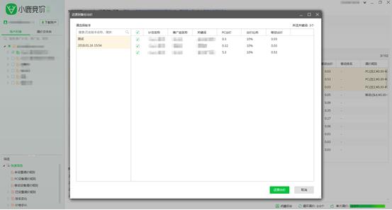 4、选取关键词(可选取多个)后点击“还原到备份出价”按键,页面弹出窗口,选择之前备份的历史版本名称,即可将关键词价格还原至之前备份后的出价。