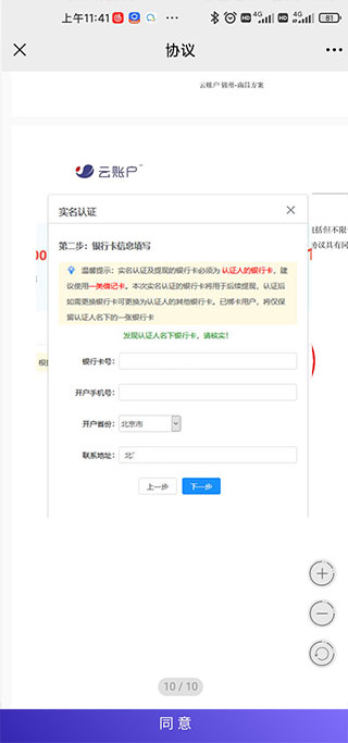 第二步:实名认证——填写银行卡信息,此部分会联网验证是否一致。如果已存在银行卡会自动调出,可直接在此基础上修改或直接确认此卡进入下一步。