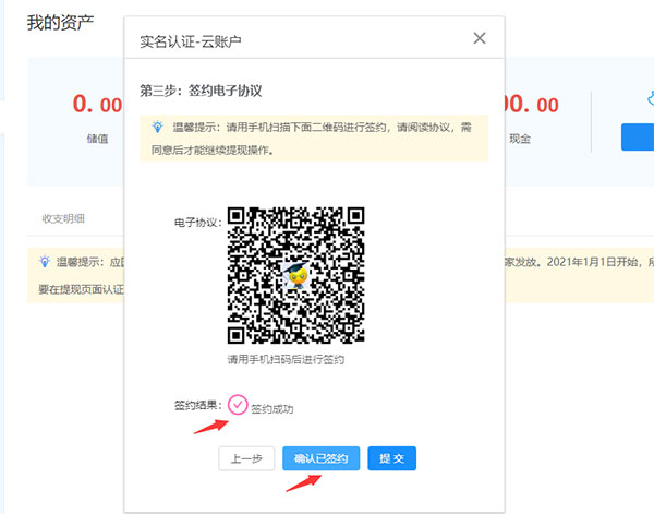 (1)系统会自动展示二维码,用户通过扫码(微信或是支付宝),在手机端完成和云账户的签约操作。如下图: