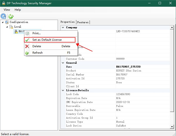 9、右键单击添加的许可证,然后将其选择为默认许可证