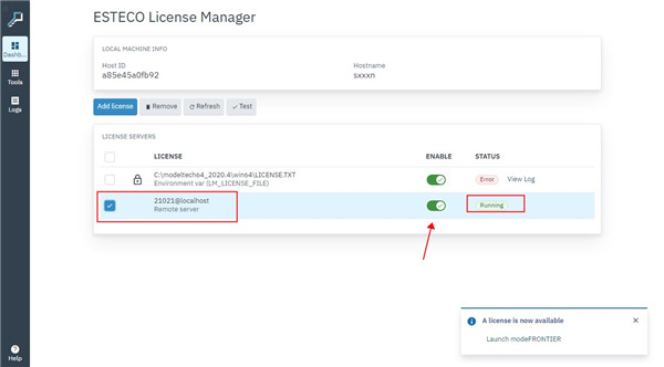 7、运行modeFRONTIER,在错误信息中点击License Manager,在打开的网页中点击Add License-From Server,然后输入下列信息: