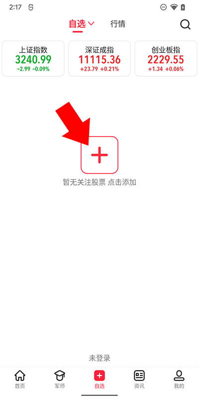 2、来到自选界面后,我们点击添加股票按钮