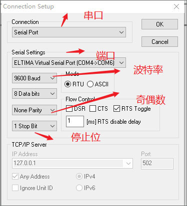 具体如下。普通连接点击菜单栏"Connection"->"Connect..."(或者按快捷键F3)弹出连接配置窗口。在连接选项那里选择"SerialPort",表示当前是用串口通信,如果使用的是Modbus/TCP,则选择“TCP/IP”串口配置:在配置窗口中配置好端口号、波特率、数据位、校验位、停止位,一般是9600波特率(9600Baud),8个数据位。ModbusPoll:Modbus主机仿真器,用于测试和调试Modbus从设备。该软件支持ModbusRTU、ASCII、TCP/IP。用来帮助开发人员测试Modbus从设备。