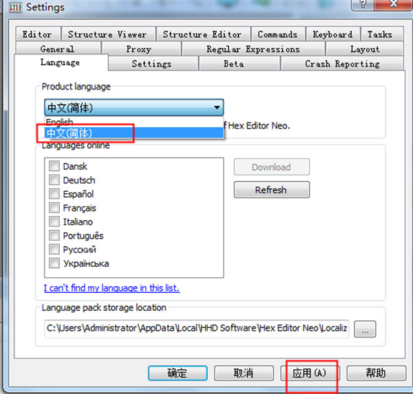 3、下载成功后,可以看到【中文简体】选项,点击【应用】;
