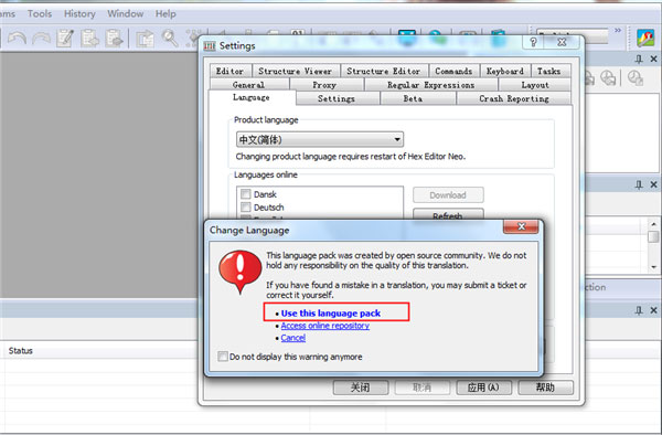 4、在弹出的窗口中点击第一项,再点击【确定】,然后重启软件即可完成中文界面设置。