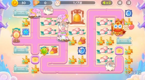 3、等到钱袋旁边的桃子打掉之后,补一个雷达,然后锁粉兔,不要让它漏掉,粉兔清掉后可以卡一下攻击距离,先锁钱袋。