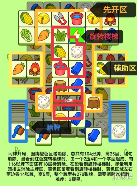 开局先消除橙色区的牌,这里压牌。尽量要让牌面保持在同一水平面,然后均匀的消除表面牌,不要跨层太多拿牌,等看到旋转楼梯后,以旋转楼梯内互相消除为主。