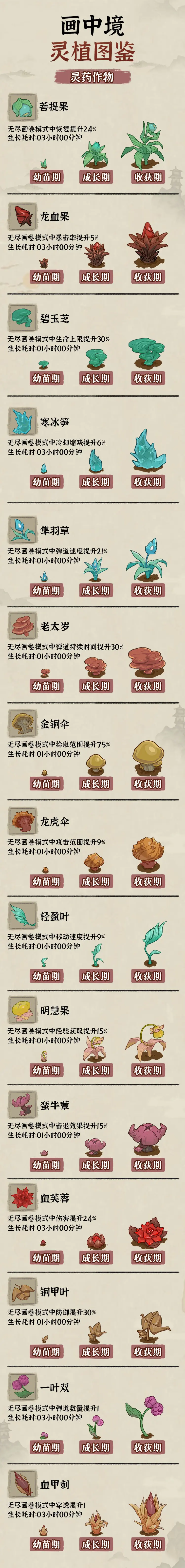 灵植种植是九重试炼画中境的主要玩法,收获灵植除了可以获得铜钱、修为等奖励之外,还可以强化玩家在无尽画卷模式的属性,下面就让小编为大家带来九重试炼灵植图鉴,一起来看看吧。