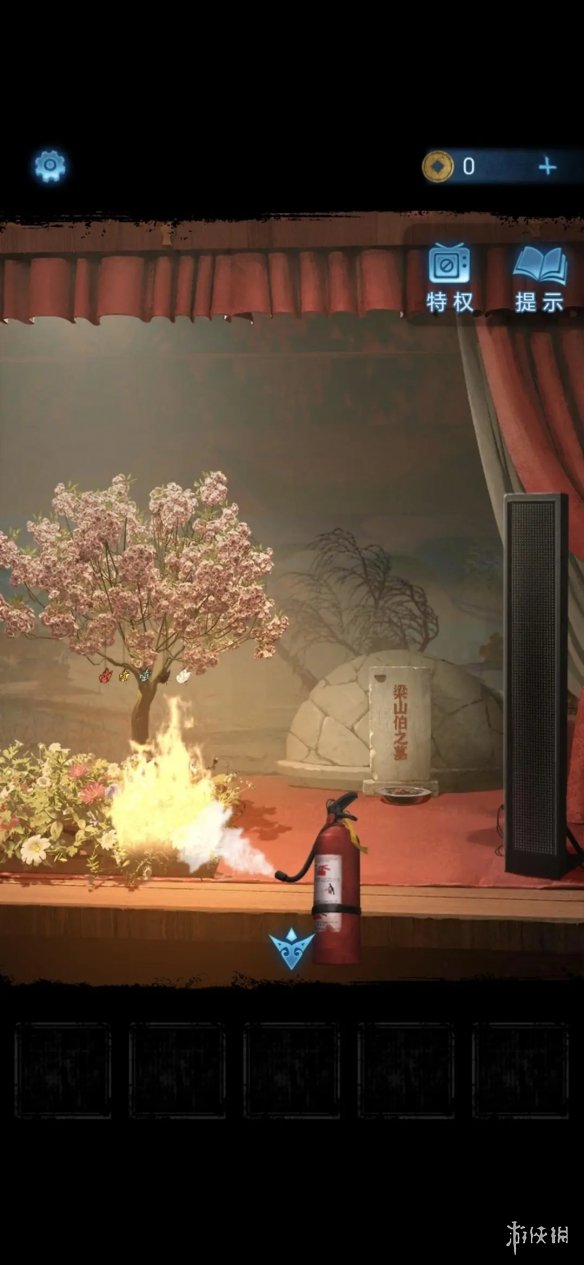 然后戏台着火,点击座椅位置查看椅背数字,解开消防栓上的锁,点击获得灭火器。
