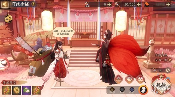 ※守缘合战:共有十层挑战,大人们可消耗「红绡纺锤」或体力挑战阻碍缘分的妖怪,成功挑战即可开启下一层,并获得「千丝缘结」等奖励,固定回合内通关还有额外奖励。