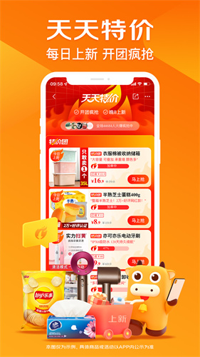 9.9元拼:每天精选百余款好货,覆盖食品、母婴、服饰、家居、数码等十多种品类。9.9元封顶!超高性价比!更享包邮到家福利。