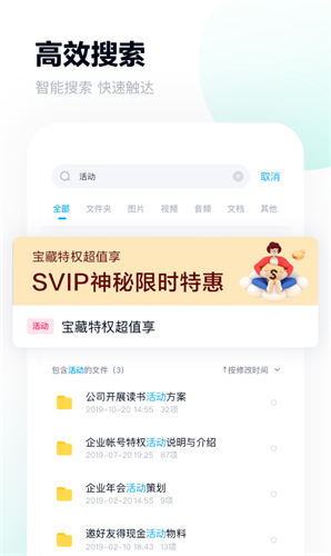 提供多种在线服务,照片:时光轴、智能分类、照片故事等;视频:在线观看、倍速播放、高清画质等,文档:在线编辑、格式转换、 文字识别等。多达数十种服务等你发掘,直接在网盘内完成操作,这才叫好用!
