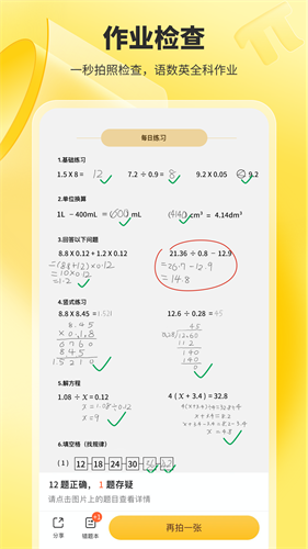 1. 拍照检查,秒判对错:只需对作业拍照,一秒就能帮您判断对错,并进行针对性的分析辅导,让孩子“知错能改”;