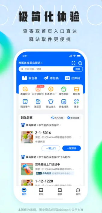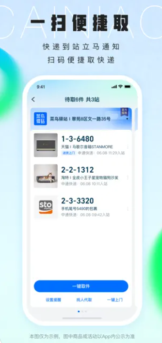 一键取件:无需取件码,使用菜鸟APP扫一扫即可一键取出自提柜和驿站包裹。