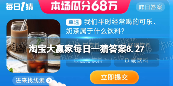 2023淘宝每日一猜活动初夏踏浪季8月27日的问题是“我们平时经常喝的可乐奶茶属于什么饮料”,不少小伙伴想知道8月27日这道题目的答案是什么,接下来就让我们一起了解一下吧。