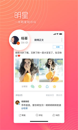 5、【明星大v动态】姚晨、谢娜、陈坤、邓超、孙俪、易烊千玺、鹿晗、杨幂、何炅、赵薇、林心如、范冰冰、李晨、杨洋、章子怡、张翰、陆毅等超多大牌明星在微博发布动态,加关注便可随时与你喜爱的明星互动,转评赞;
