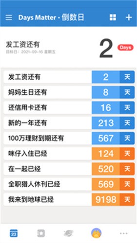 可以设定距离过年还有多少天,距离爸妈的生日还有多少天,与ta相爱多少天等等,还可以非常方便的计算各类日期,并且还支持云端同步,在各大应用商店好评如潮,倒数日请认准Days Matter!