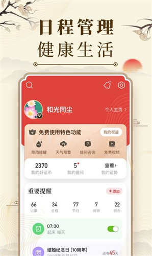 中华万年历app去广告纯净版不仅提供日历信息,还有全新改版的天气功能。用户可以获得实时的天气状况,包括实况天气、二十四小时预报和四十日天气趋势等。这些精确的天气数据让用户能够更好地了解当地的天气情况,为日常生活和旅行提供实用的参考。