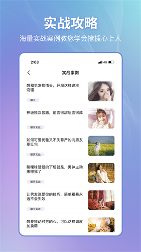 恋小帮免费版不仅提供了丰富的聊天话术,还提供了大量的土味情话语录和恋爱攻略。这些资源可以帮助用户迅速脱单,建立稳固的恋爱关系。平台致力于满足年轻人的恋爱聊天需求,提供有趣又实用的工具和内容。