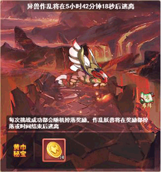 7、作乱妖兽:黄巾首领事件触发时可以通过剿灭获得奖励,每次挑战成功奖励随机掉落,作乱妖兽将在宝物完全掉落或时间结束后逃离;