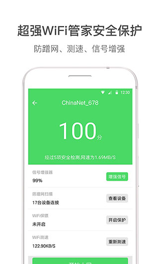 WiFi伴侣做你的安全管家,内置WiFi安全监测功能,一键检测:是否可以正常访问互联网;DNS服务器食是否正常;是否存在ARP欺骗攻击;是钓鱼网否;是虚假WiFi否。免费上网,为你护航!