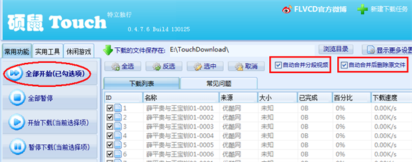在Touch下载器中设定好视频存储途径后,点全数起头(已勾选项)就起头批量下载整部电视剧了。