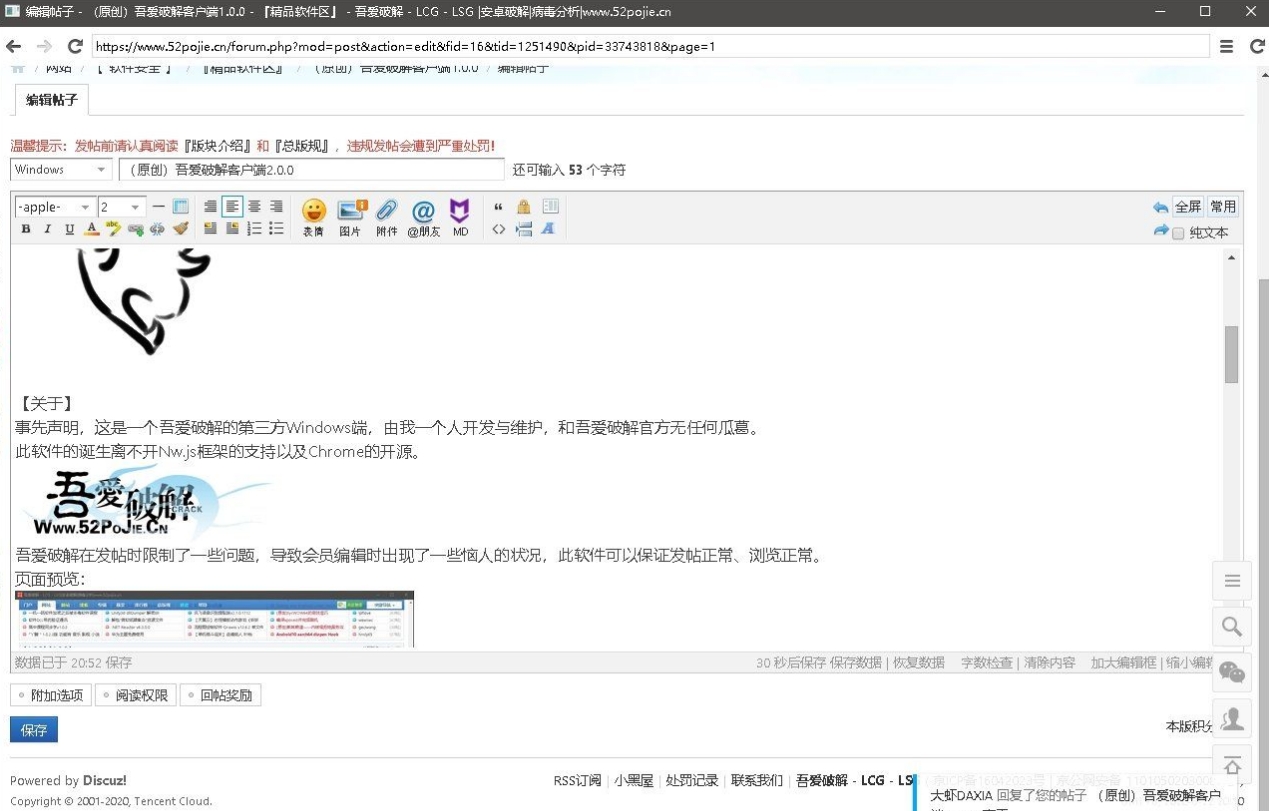 吾爱在发帖时限制了一些问题,导致会员编辑时出现了一些恼人的状况,此软件可以保证发帖正常、浏览正常。