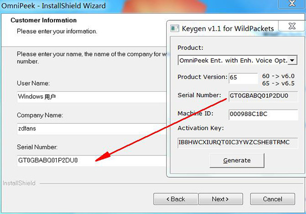 5、 双击运行Omnipeek_keygen.exe注册机,选择omnipeek,然后将序列号复制带注册界面,用户信息随意填写。