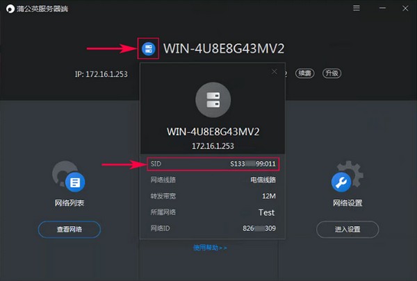 通过帐号密码登录服务端客户端后会生成一个SID,点击主机名或旁边的图标即可查看SID。